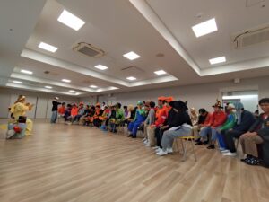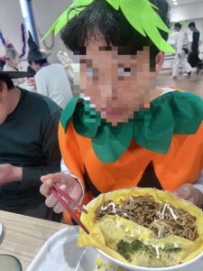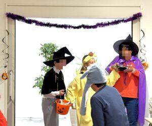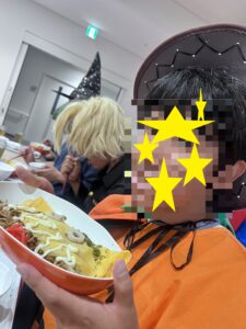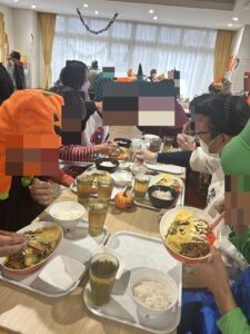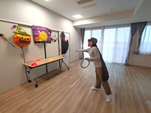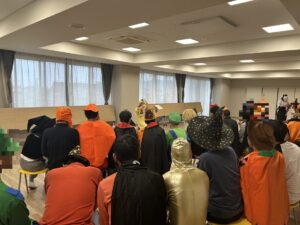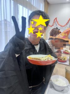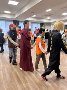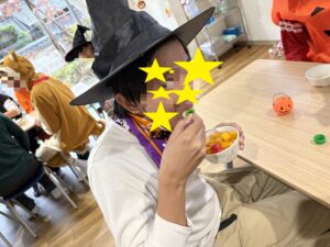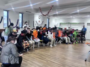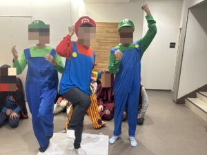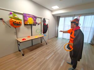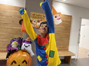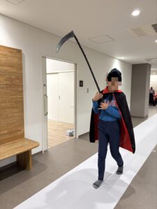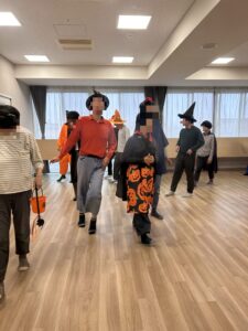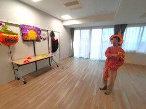 午前中にはハロウィンDRを!天候があいにくの雨だったので館内にはなりましたが、全員で仮装してDRをしました。いつもとは違う服装で皆さん楽しそう♪